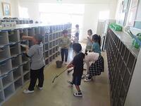 ほうきを持ってはく。ぞうきんがけをする。靴箱掃除にトイレ掃除、窓拭きや、バケツ、ちりとりも使います。みんなが使う場所を、みんなで分担してきれいにする作業。その学年に応じて働く。