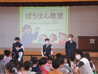 3時間目には防犯教室。初めての給食があり、そうじの練習。5時間目の学習ありで、