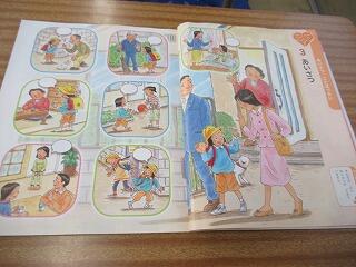 1年生は、いろいろな場面でのふきだしであいさつを考えるお勉強をしていました。