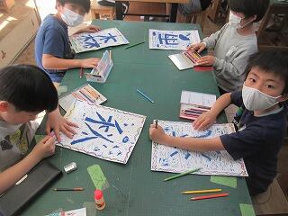 5年生図工。思い思いの文字版画の回りをさらに飾る作業です。個性が光ります。