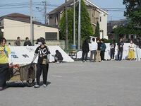 朝早くから、職員でテントをたて、ラインを引き、用具の準備をしました。水たまりに砂を入れ、グランド整備をします。