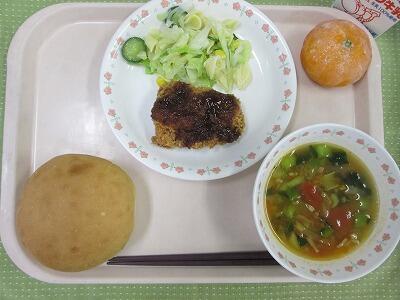 牛乳・丸パン・チキンカツ・マカロニサラダ・キャベツとトマトのスープ・冷凍みかん