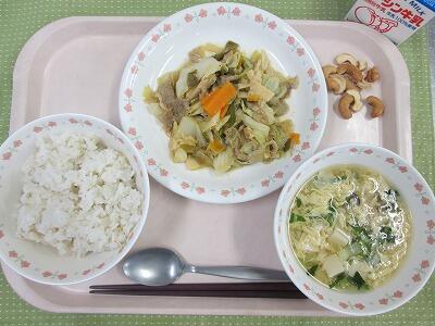牛乳・ごはん・春キャベツのホイコーロー・えびとたまごのスープ・炒りカシューナッツ