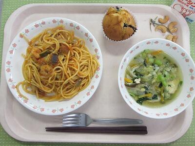 牛乳・ラタトゥイユスパゲティ・キャベツのスープ・ブルーベリーマフィン・カシューナッツ小魚