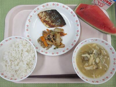 牛乳・ごはん・さばのカレー焼き・ゴーヤチャンプルー・もずくのみそ汁・すいか