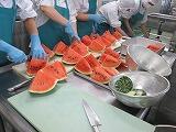 暑い中でも元気になれるように今日は沖縄県でよく食べられている食材を使った料理です。ゴーヤやもずくは沖縄料理に欠かせな食材です。「すいか」は夏を代表する食材のひとつです。千葉県産の大きな「すいか」を切るのはとっても大変でした。