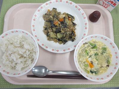 牛乳・ごはん・マーボーなす・トックとたまごのスープ・ひとくちぶどうゼリー