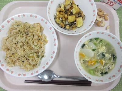 牛乳・キムチチャーハン・大豆と小魚の揚げ煮・トックとたまごのスープ・炒りカシューナッツ