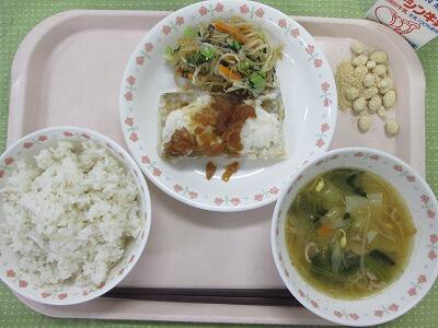 牛乳・ごはん・たちうおのたまねぎソースがけ・中華風サラダ・みそワンタンスープ・きなこ大豆