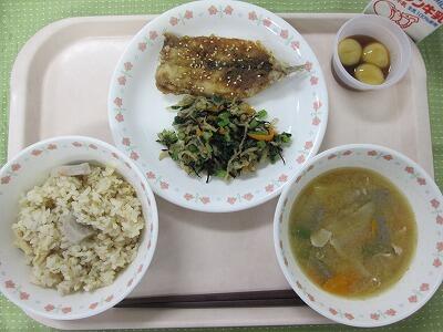 牛乳・さといもごはん・いわしのかば焼き・切干大根のあえもの・ごま仕立てのみそ汁・お月見だんご