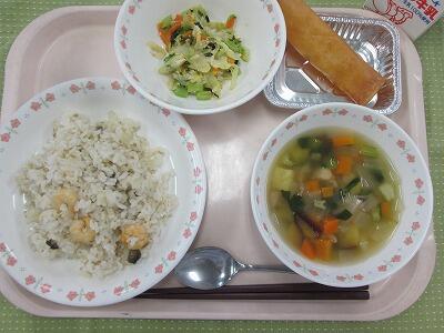 牛乳・パエリア・ひじき入り鉄人サラダ・ポテトとたまごのスープ・オートミールビスケット