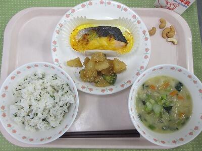 牛乳・わかめごはん・ますのもみじ焼き・だいこんのごまだれかけ・呉汁・炒りカシューナッツ