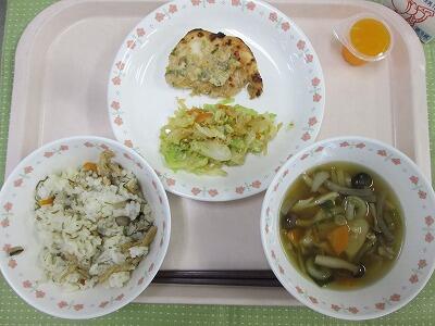今日、使っている食材は何の仲間かな?子どもたちが食に関心をもてるよう声かけをし、充実した日々を過ごせたと思います。子どもたちもいつもより、たくさん食べてくれていたようです。