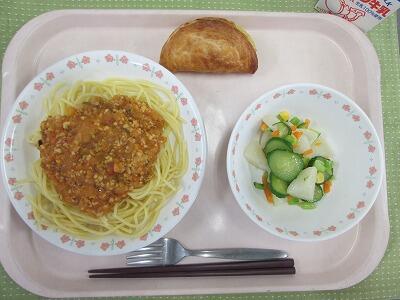 牛乳・スパゲティ大豆ソース・柏野菜のサラダ・スイートポテトパイ