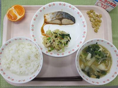 牛乳・ごはん・いなだの照焼き・おかか和え・柏野菜のみそ汁・みかん・カリカリ大豆