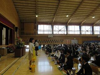 前日の大雨ですんだ空の中、さわやかな陽射しが注ぎ、104名の笑顔が体育館にあふれました。