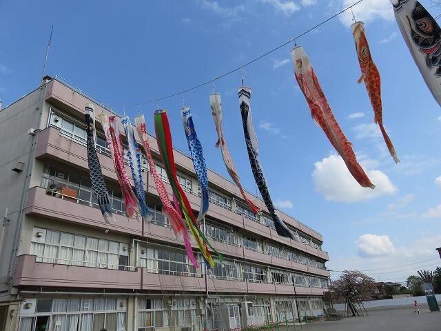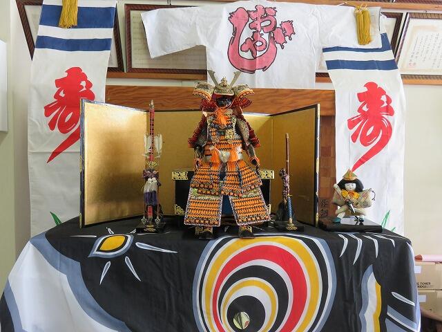 青空を泳ぐ鯉のぼりに元気をもらい、職員玄関にどっしり構える兜に励まされ