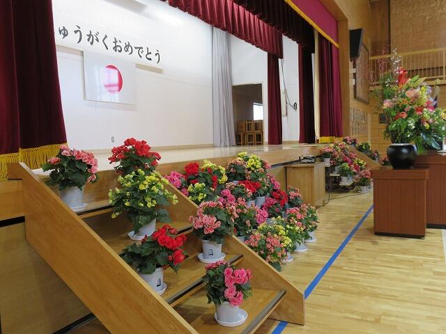 全職員、桜もくすのきも、たくさんの花、ウサギさんも、みんなで104名の新入生をお祝いします。