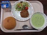 今日の給食はハンバーグ、グリーンピースポタージュ、キャベツしめじのサラダ。