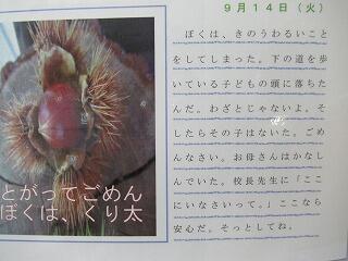 そこで校長室前に、新コーナー「とがってごめん。ぼくは、くりた」を置きました。ご覧ください。