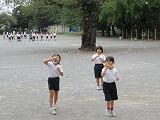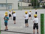 1年生はシャボン玉を飛ばす。♪「しゃぼんだまとんだ 屋根まで飛んだ 屋根まで飛んで 壊れて消えた~」