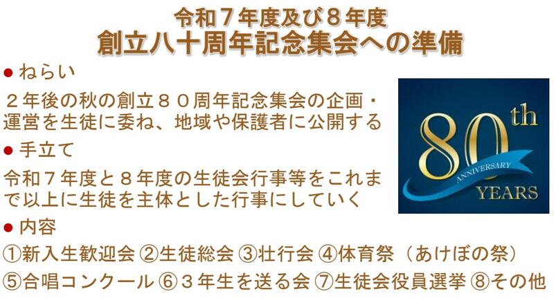 〇昨年から生徒会役員の生徒たちと創立80周年に向けてのプロジェクトの構想を話し合っていましたので、土中でも早速生徒会と同じような対話をしていくつもりです。新しい出会いが楽しみです。