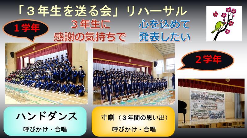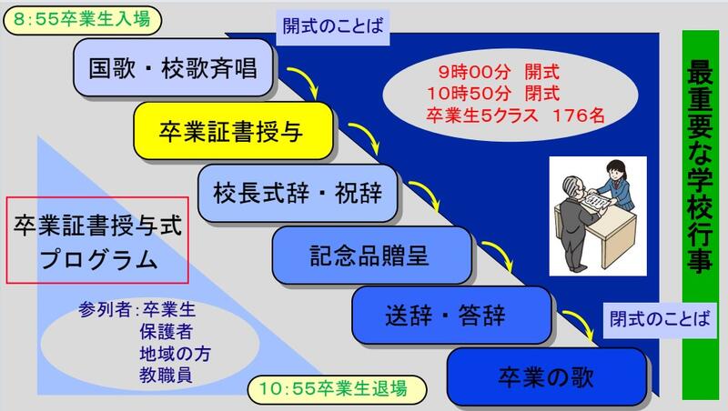 〇本日は令和6年度修了式を行います。今年度の登校日数は1学年が196日、2学年が199日でした。