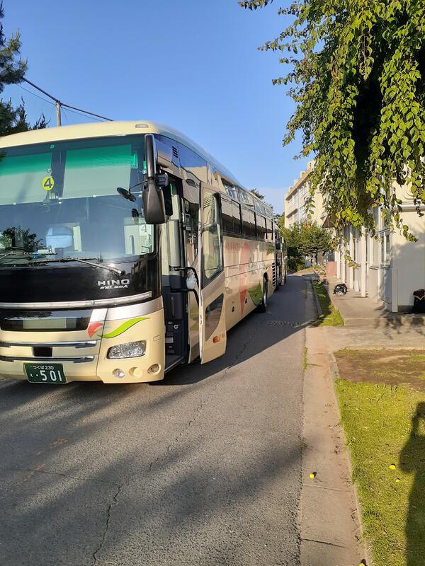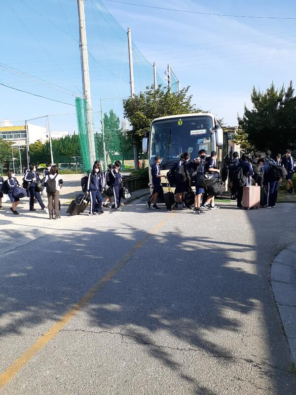 ○生徒の三日間の様子をほぼリアルタイムで配信していきます。バス五台が到着しました。朝は快晴です。