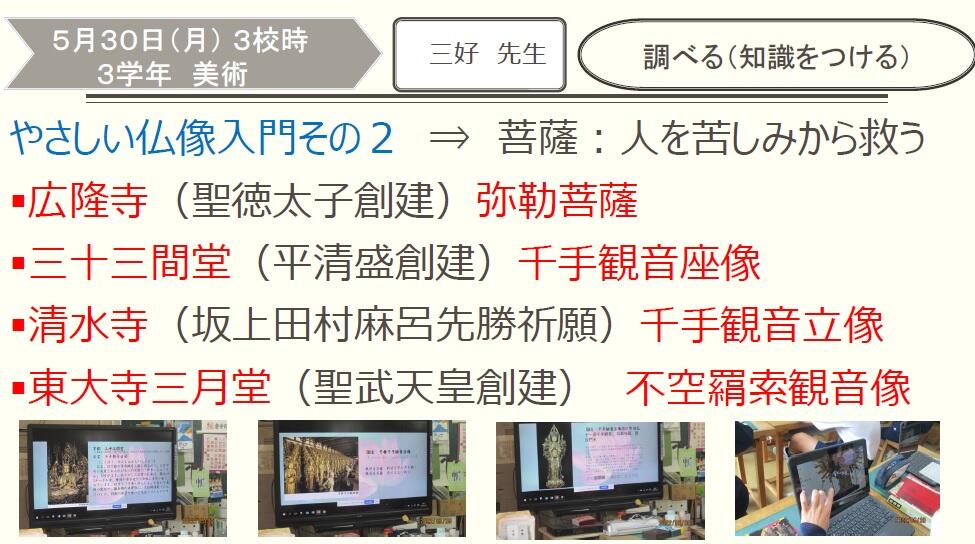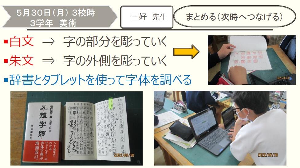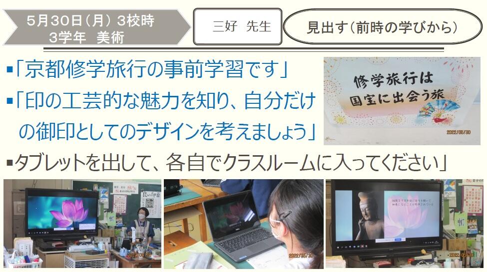 5月31日(火)授業風景9(3学年美術) 投稿日時 : 2022/05/31 富勢中学校 〇来月の京都・奈良の修学旅行とコラボしている授業です。さすが3年生ともなると、教員の説明を受けて自分のデザインへスッと入っていきます。 須藤昌英 {{options.likeCount}} {{options.likeCount}}