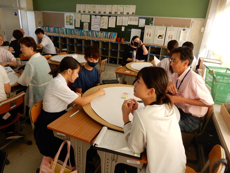 〇参加者130名が、富勢小の5つの教室に分かれて、円陣を組みながら3色の付箋紙を使って、活発な話し合いが行われました。3つのワークの内容を紹介します。