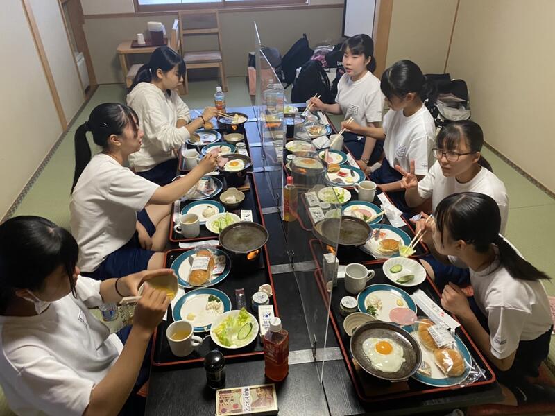 六時半起床、朝食、部屋の片付け、荷物の積み込みとあわただしく始動しました。本日は天気の問題はありませんが、気温が30℃を超える予報です。午前中のクラス別行動は、疲労もあるので、熱中症に留意させます。今朝の朝食は、パン、目玉焼き、サラダ、牛乳、スープ、ヨーグルトです。