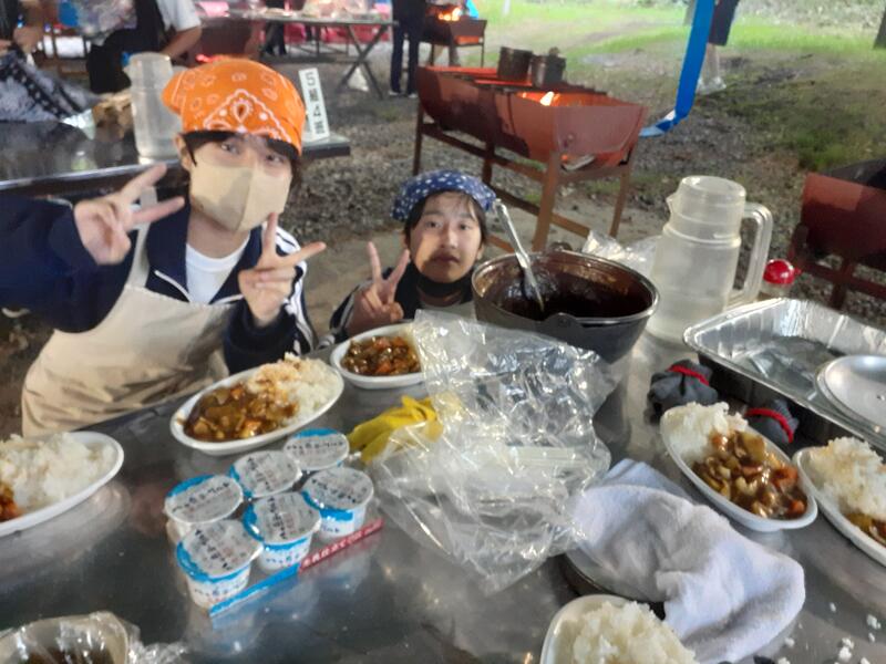 ○ゆっくり休む間もなく、カレーライスづくりに入ります。炊事場は屋根があるので、雨でも問題はありません。ただし例年ですと、一年生の時に、カレーライスづくりを校外学習で行っていますが、昨年は川越市のフィールドワークにかえたので、さて上手く出来るでしょうか?楽しみです。カレーができたら、かつをのっけて、かつカレーにします。ご飯の芯があったり、逆に水分が多くてペチャペチャだったり、「やった!」「残念!」など、イロイロは本音が聞けます。