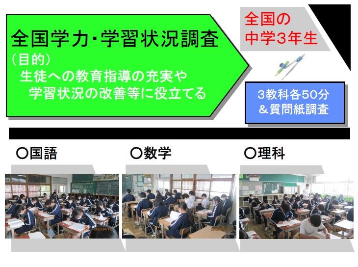 〇この4月に毎年、全国の中学校3年生を対象に行っていますが、本日午前中に、3教科のテストと学習や生活に関するアンケート調査を行いました。