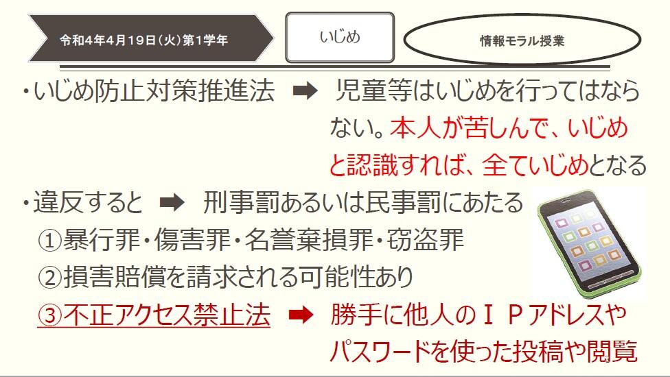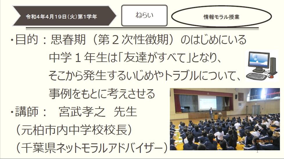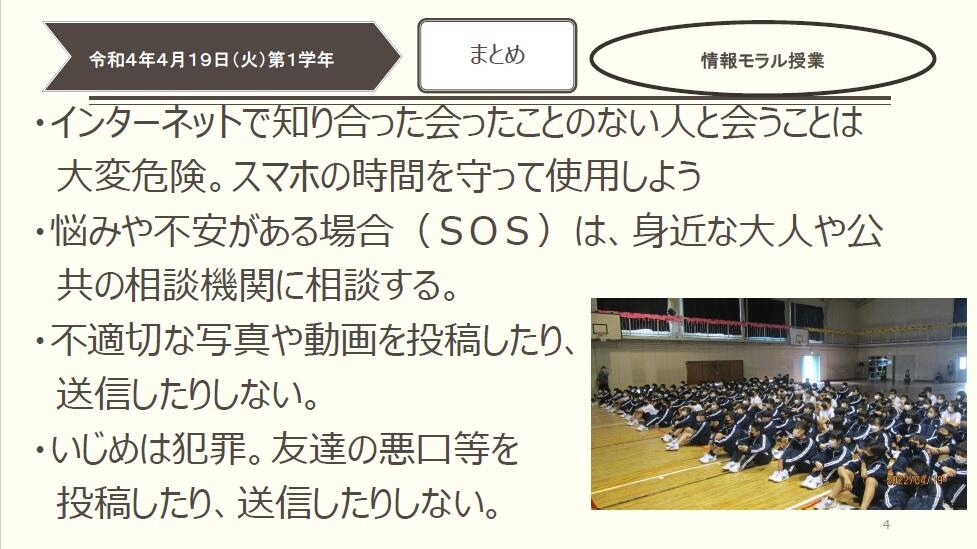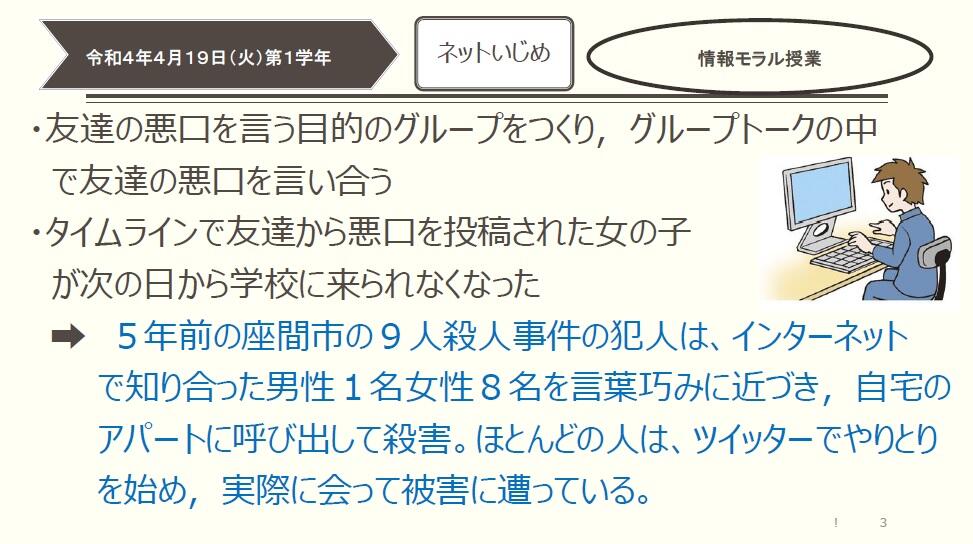 〇昨日、講師を招いて、新入生にネットモラル授業を行いました。