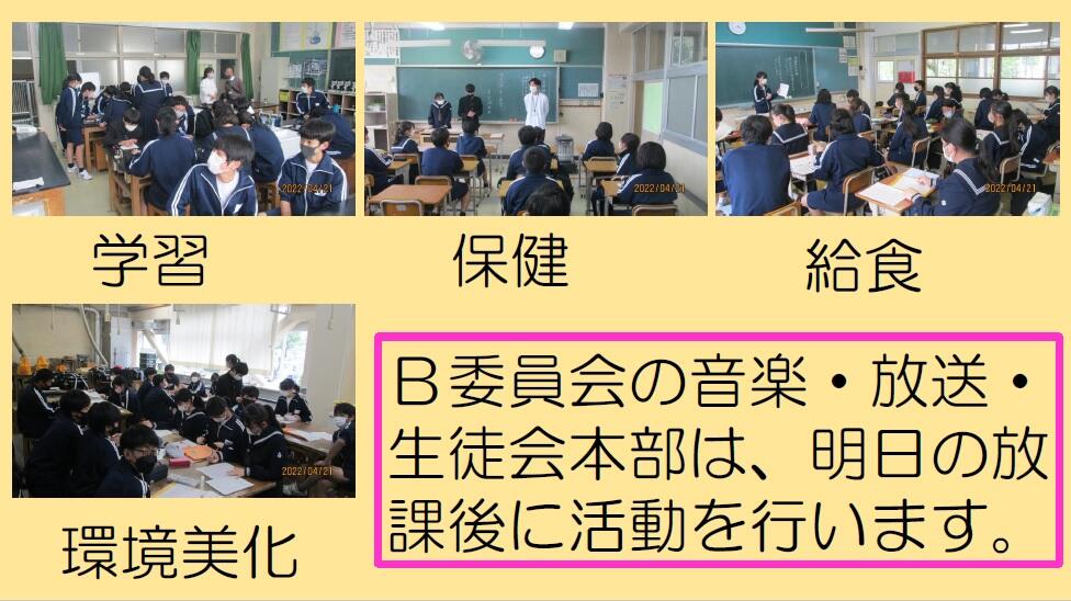 〇本日と明日の放課後に、前期委員会を行います。委員や担当先生の自己紹介や役員決め、活動目標等を話し合います。