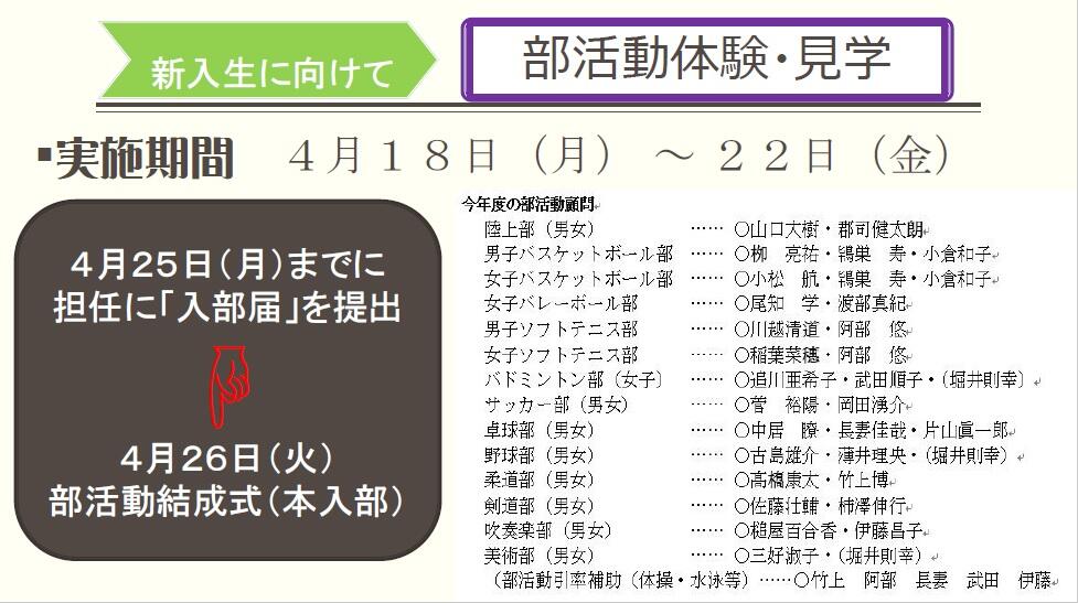 〇このように、中学生の学習が一つの起点となり、大人になっても物事を考えていく視点や学び続ける姿勢を身に付けていけるのではないでしょうか。水曜日から正式日課が始まります。いろいろな授業の中で、生徒たちが身近な問題や疑問に感じることに、興味関心をもってもらいたいものです。