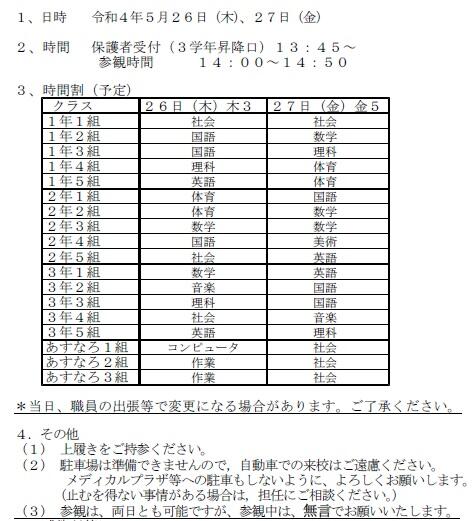 〇今週の木曜日と金曜日の5校時は、今年度初の保護者授業参観を行います。ご都合をつけていただき、ご参観ください。なお、4月27日に配付した時間割と下記の授業一覧は一部変更になっておりますので、ご了承ください。