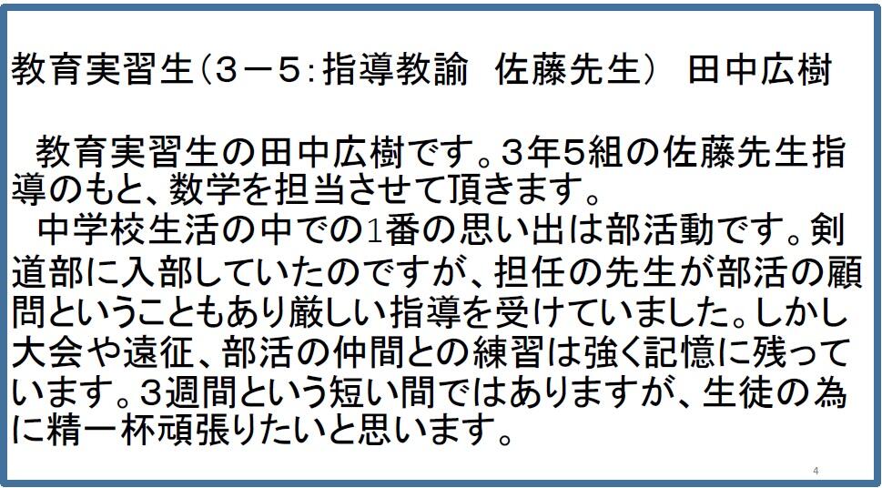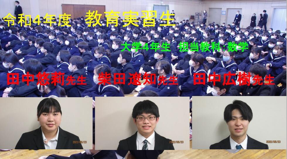 〇本日より3週間、大学4年生3名が教育実習を本校で行います。全員が本校卒業生ですので、我々の後輩を育てるつもりで指導していきます。