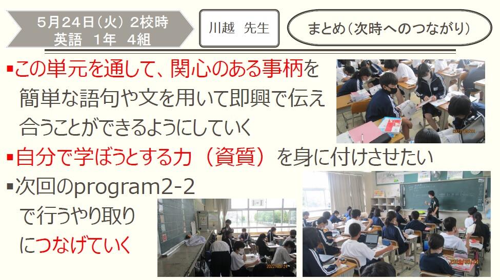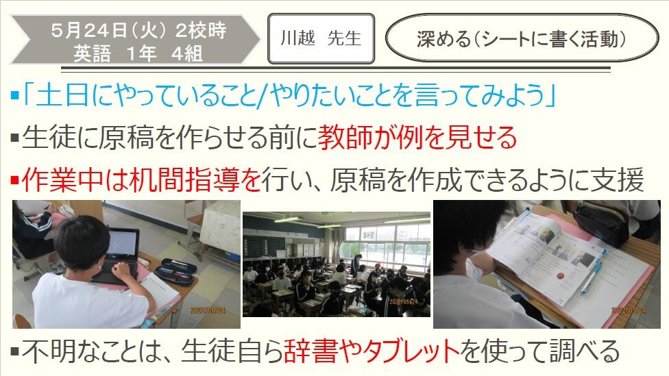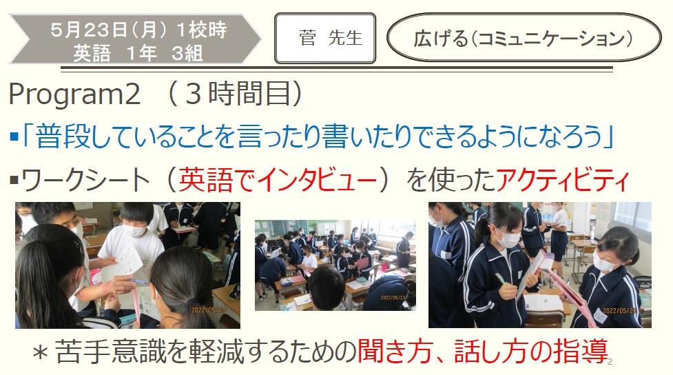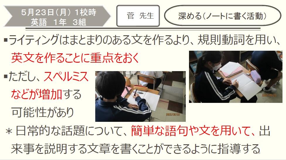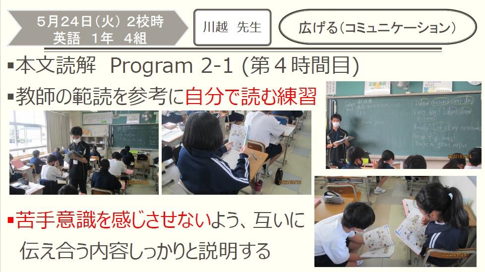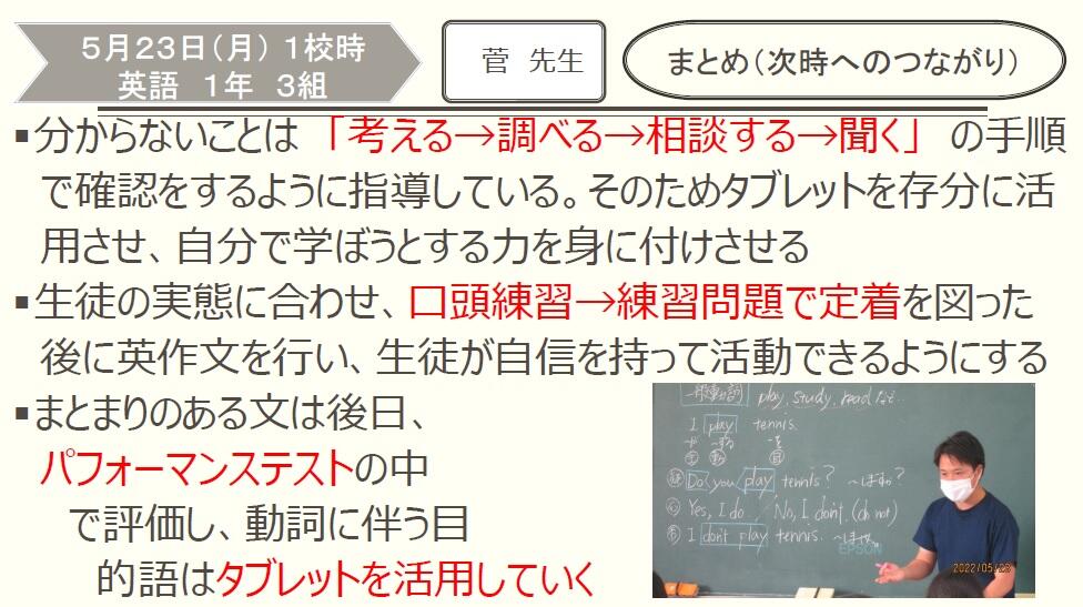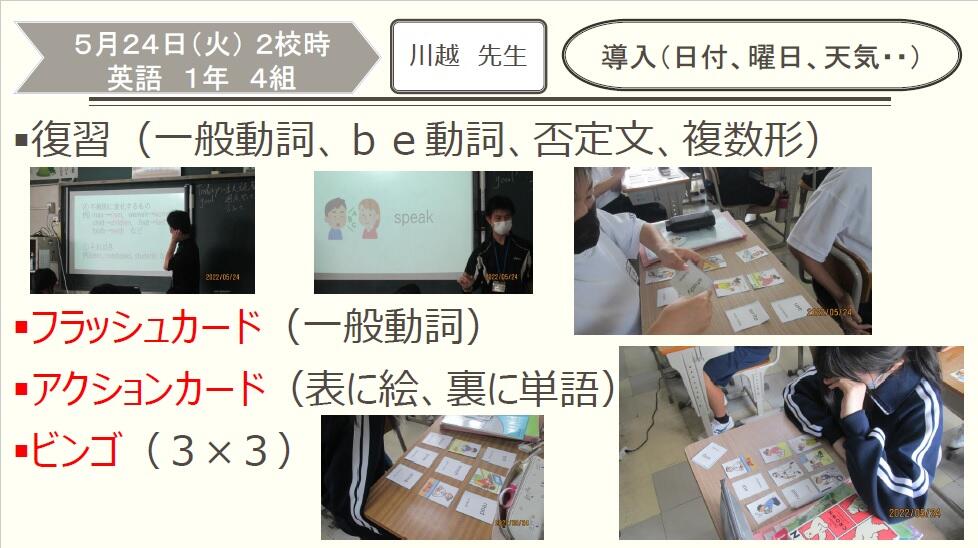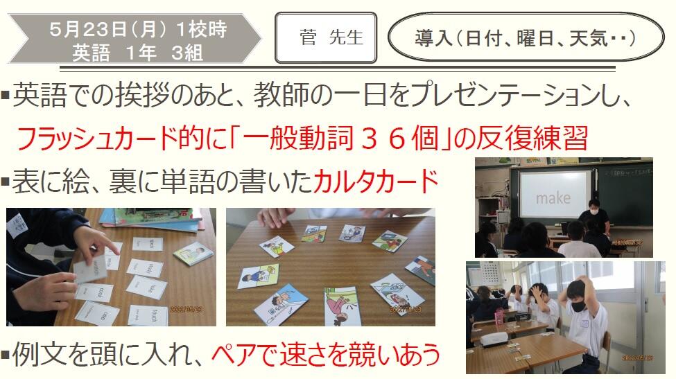 ・絵を見ながら、ゲームをしながら生徒が声を出し参加型の授業で、楽しんで学んでおりました。こちらも楽しく拝見いたしました。(1年英語)