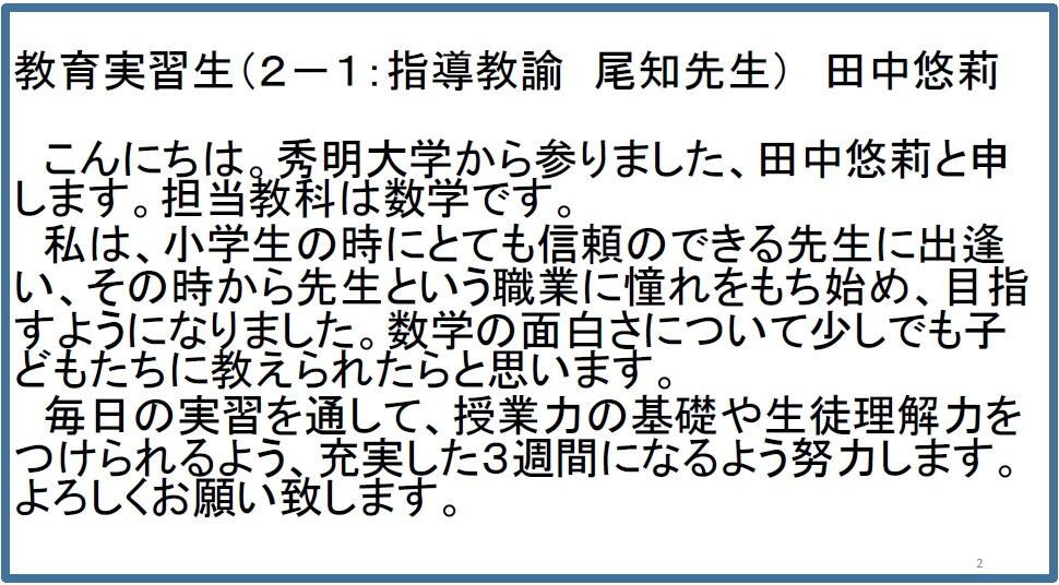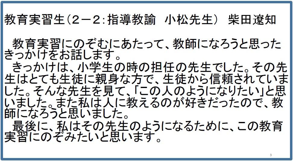 〇3人とも担当教科は数学で、このようなことは私も経験がありませんが、私の専門でもありますので、指導担当の尾知・小松・佐藤教諭と一緒に、生徒に数学の楽しさをわかってもらえる授業づくりを考えていきます。