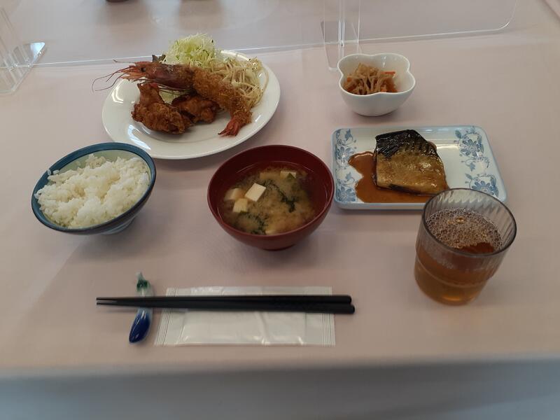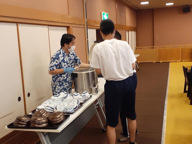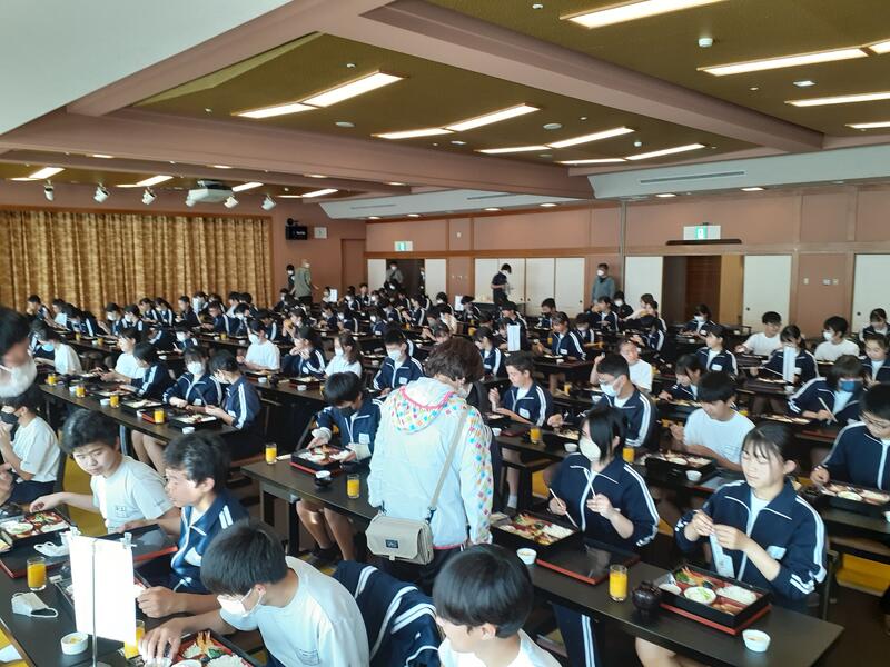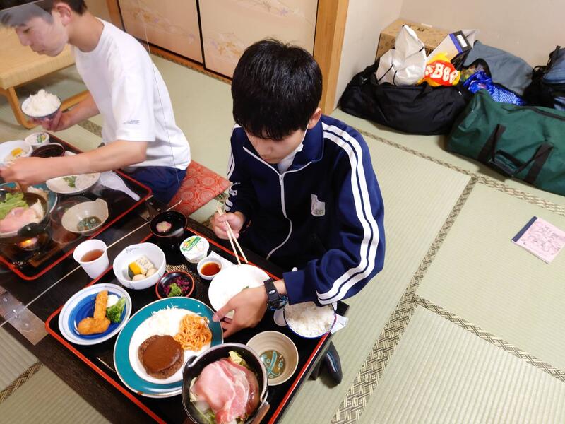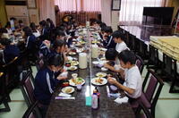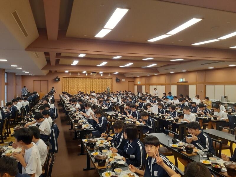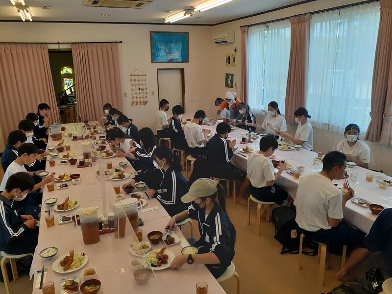 二回目の夕食です。みんなほぼ元気です。私などはお昼におにぎり三個でしたので、あまりおなかがすきませんが、さすがは食べ盛りの中学生です。黙々と食べて、おかわりもしています。