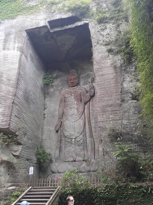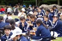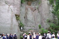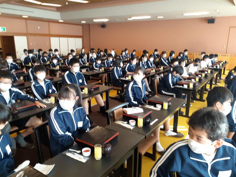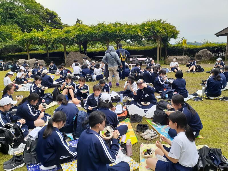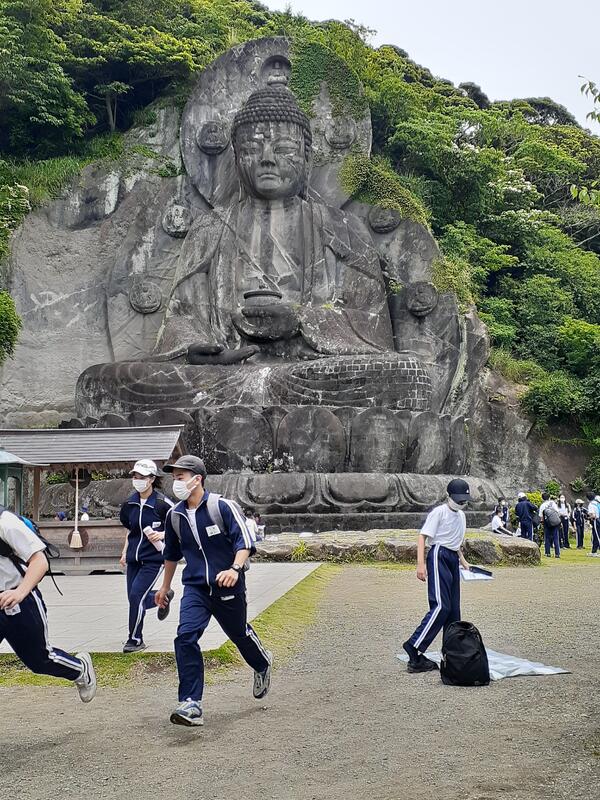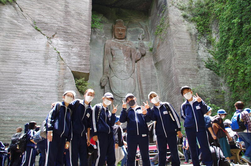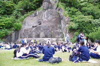 日本寺大仏に到着し、昼食は用意してもらったお弁当(おにぎり三個、卵焼、ウィンナー、唐揚げ、ポテトサラダ)をみんなで食べます。生徒は持ってきたおやつも食べています。