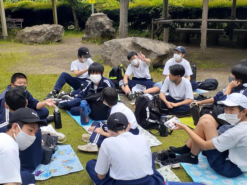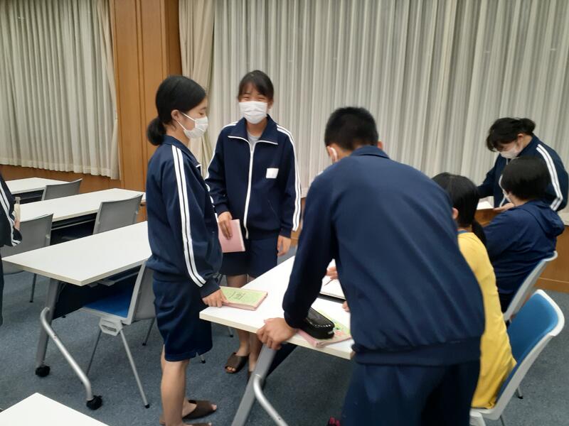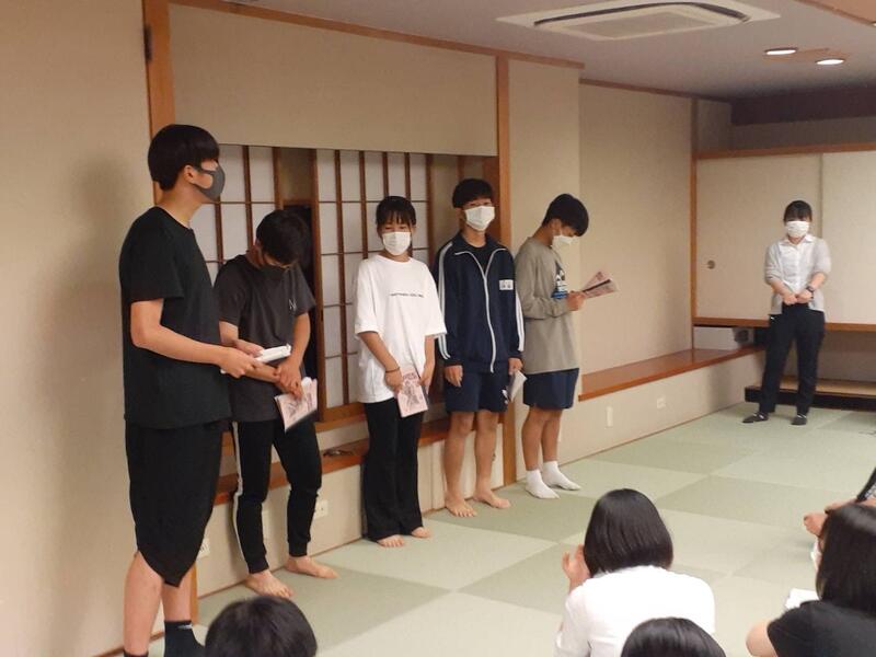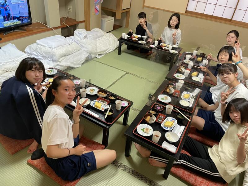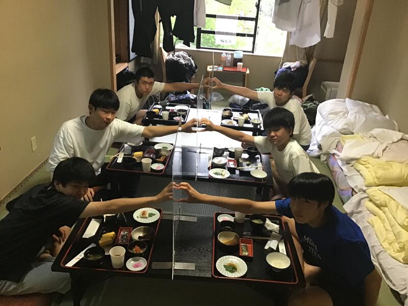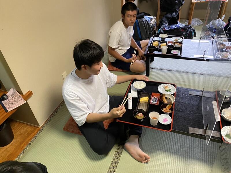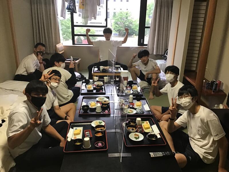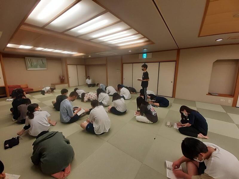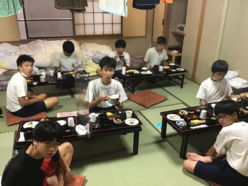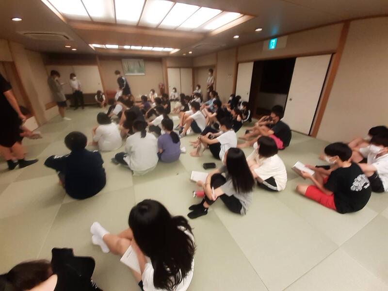 7時からは、入浴、学級会議、自由時間をクラスごとにローテーションしていきます。昼間の蒸し暑さから、疲労の様子が見える生徒もいます。入浴したら、部屋でゆっくりしてもらいます。クラスの反省会では,良かったところと明日へいかしていけるところを確認していました…担任から、『今日は楽しかったですか』の問いに、『ハイ』と答えている生徒たちが多く、ホッとしています。