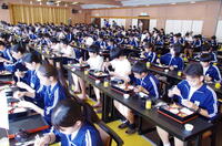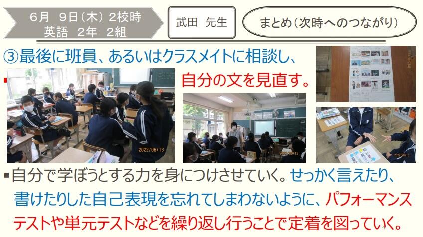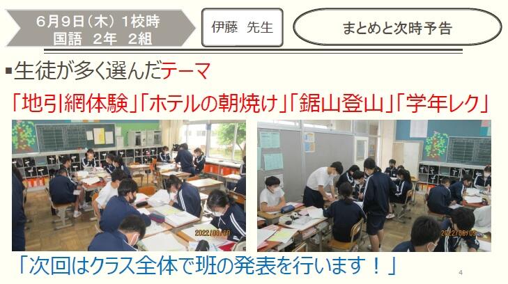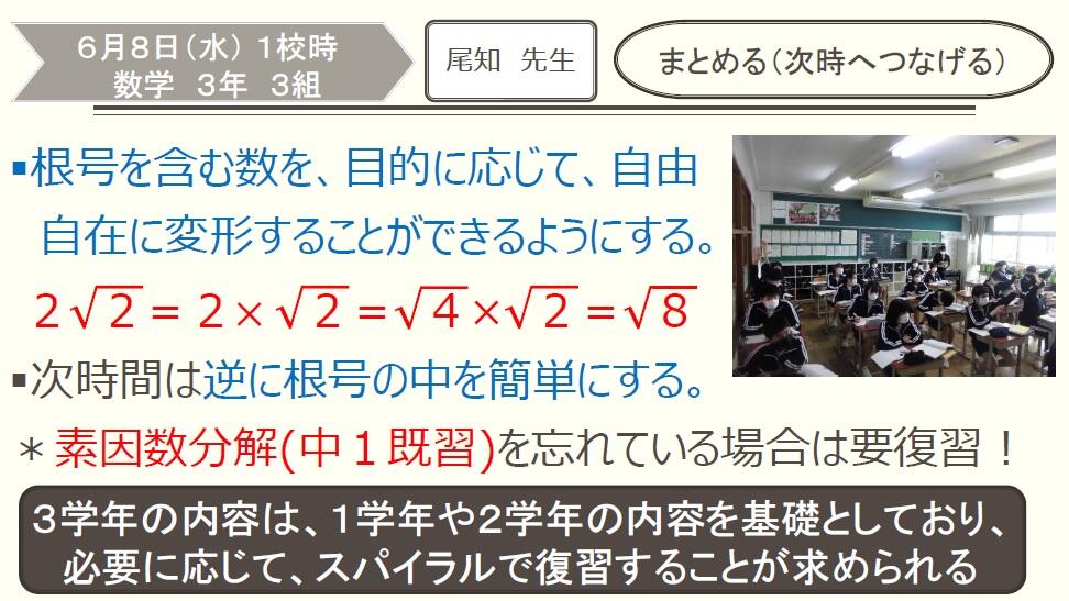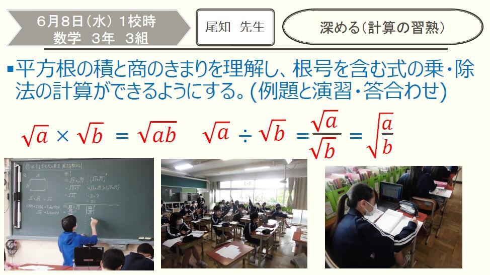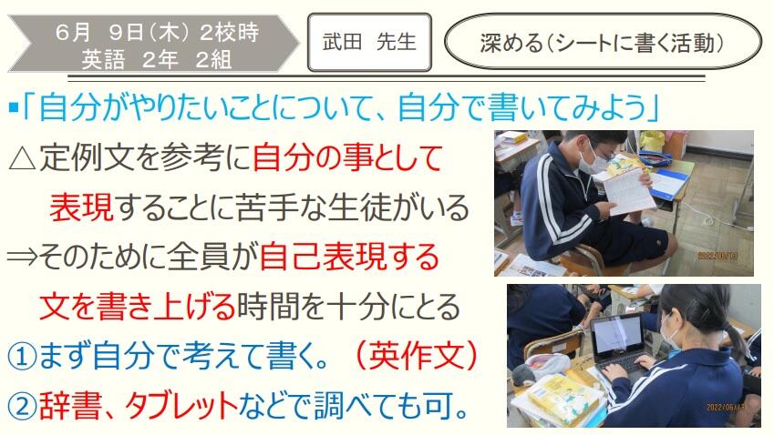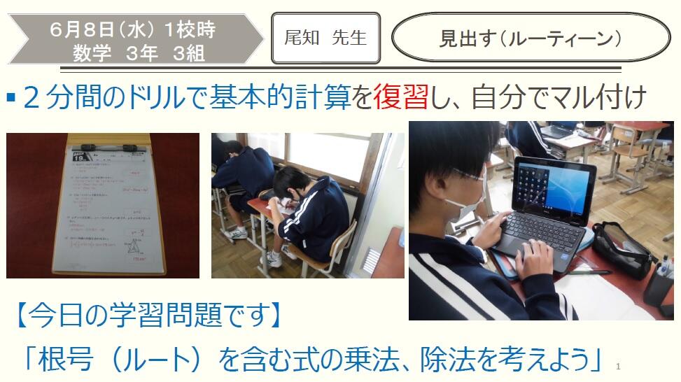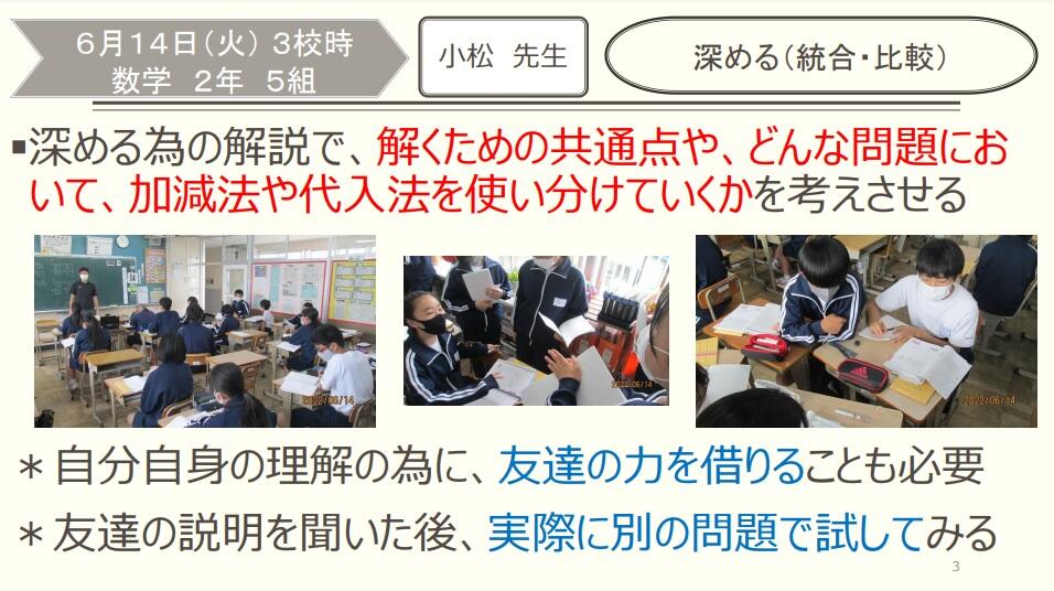 〇来週末に修学旅行を控えている3年生の授業です。その時間の学習課題を意識し、教員や生徒の説明を理解した上で、自ら問題に取り組んでみる姿勢が、「さすが最上級生」との印象をもました。