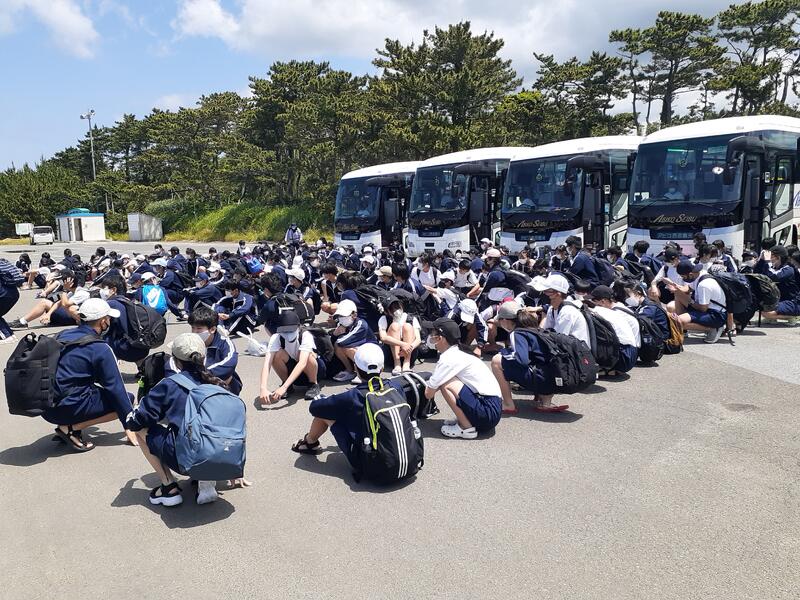 富勢中前にバスが到着しました。この二泊三日の話を家庭で聞いてあげて下さい。月曜日と火曜日は休みとなりますが、木曜日と金曜日は期末テストになりますので、身体を休めつつ、テスト準備もお願いします。それでは三年生の皆さん、お疲れさまでした。さようなら。須藤昌英