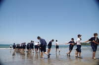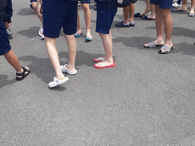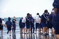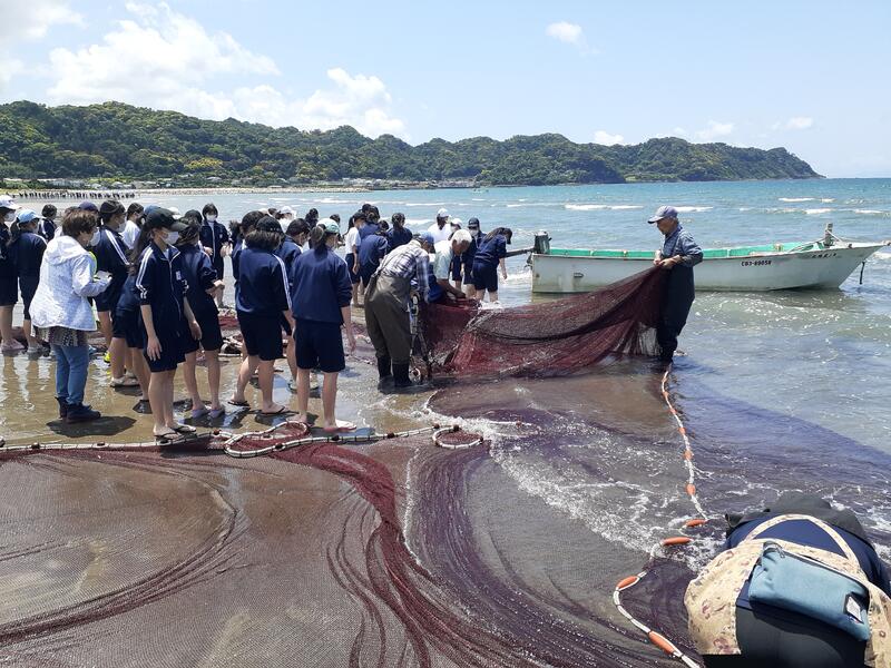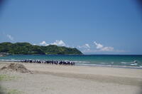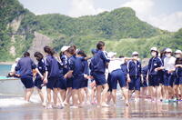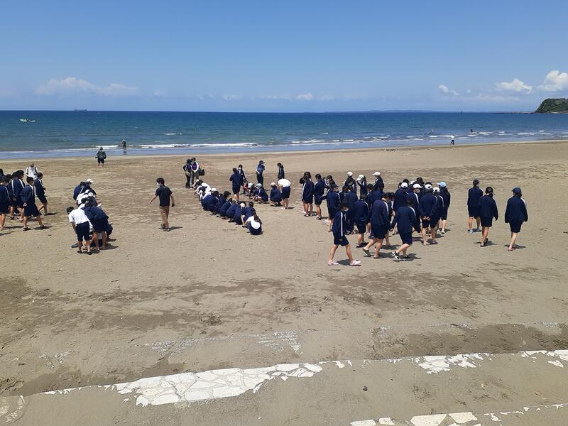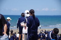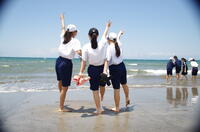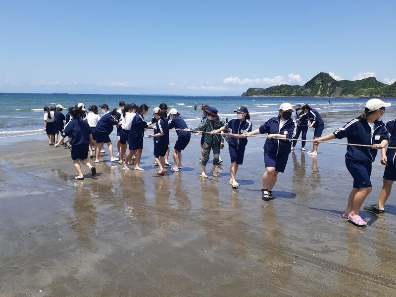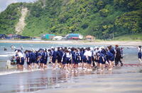 岩井海岸に到着。サンダルで浜に向かいます。サンダルを忘れた生徒は、裸足で参加です。江戸時代からの漁法を体験します。