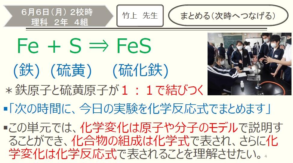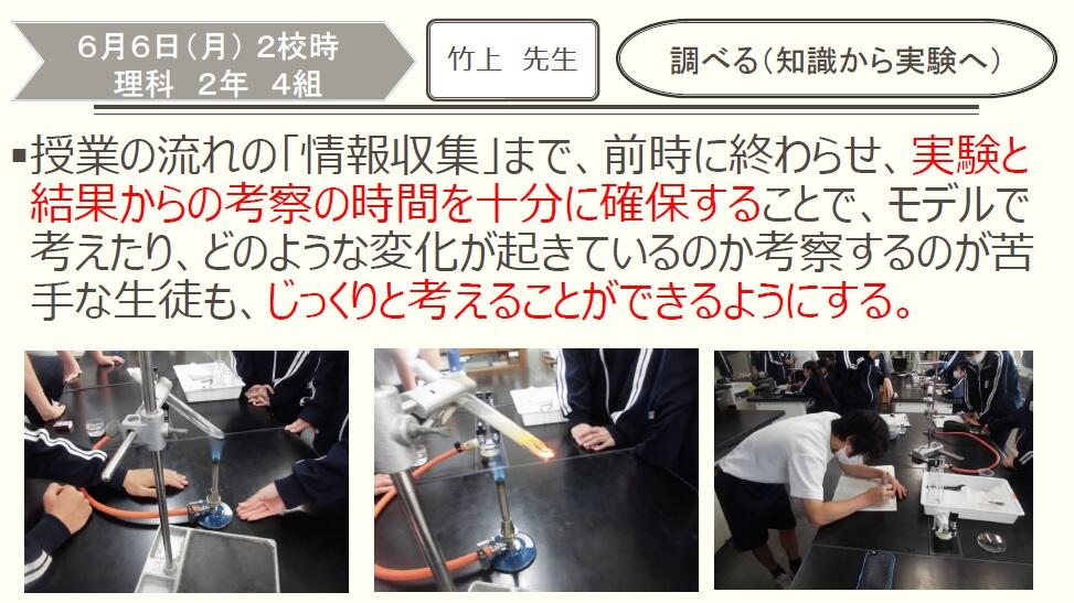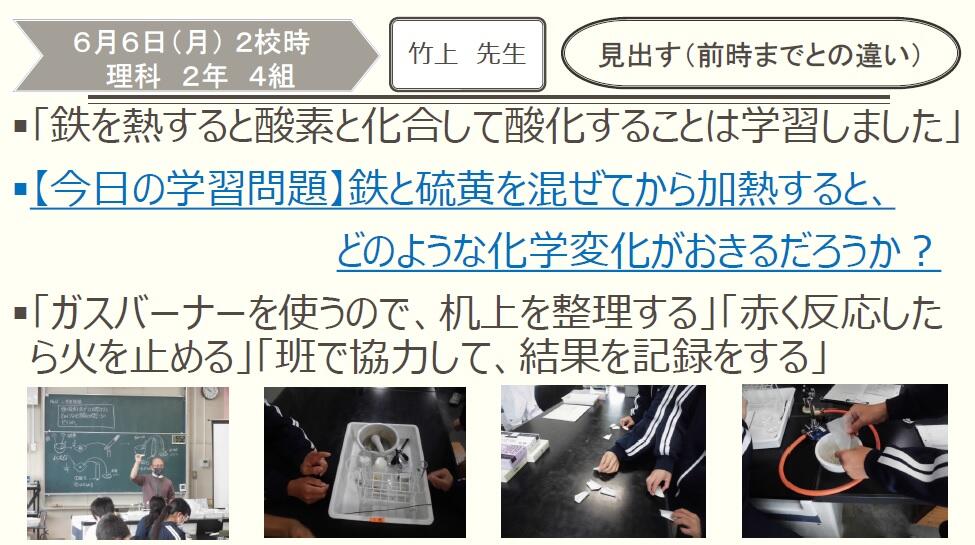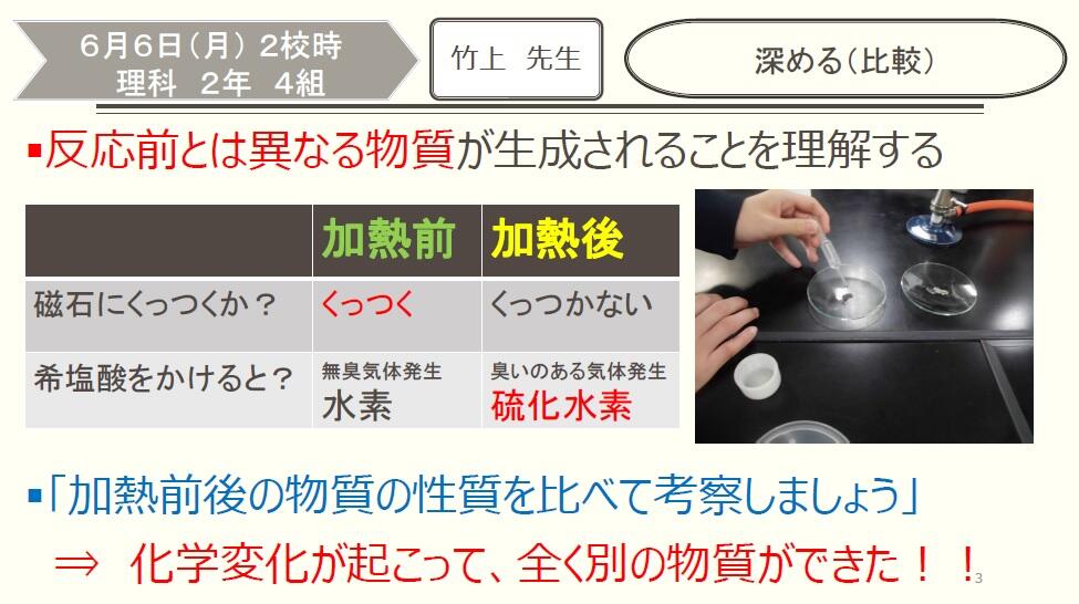 〇先週、林間学校から戻った2年生の授業です。実験の操作(ガスバーナーや塩酸などの薬品の扱い)はだいぶ手馴れています。ただ結果だけでなく、途中の変化を見逃さずに観察できるか否かは、個人差を感じました。「わからなければ教科書をみればいい」と教科書に頼りきりになるのではなく、自分が観察した事実に対して、教科書はあくまでも参考書としてみていくことが大切だと感じます。