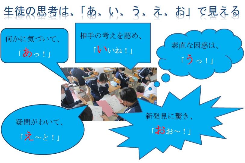 〇そのときに、次のような「あ、い、う、え、お」のような生徒の反応がよく見られます。ただしこれらは、授業をしている先生がすべて把握することは難しく、外から客観的に授業を観察している人の方がわかりやすいものです。そしてそれを授業が終わった後に、授業者に伝えるのも、私の役目です。