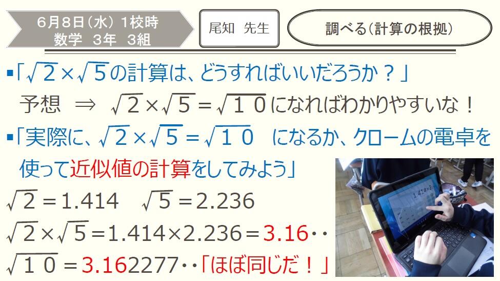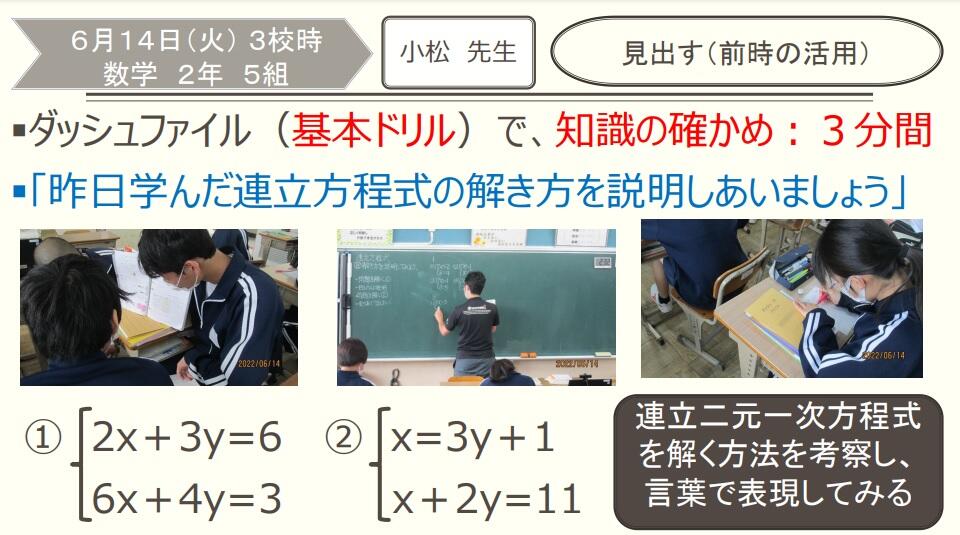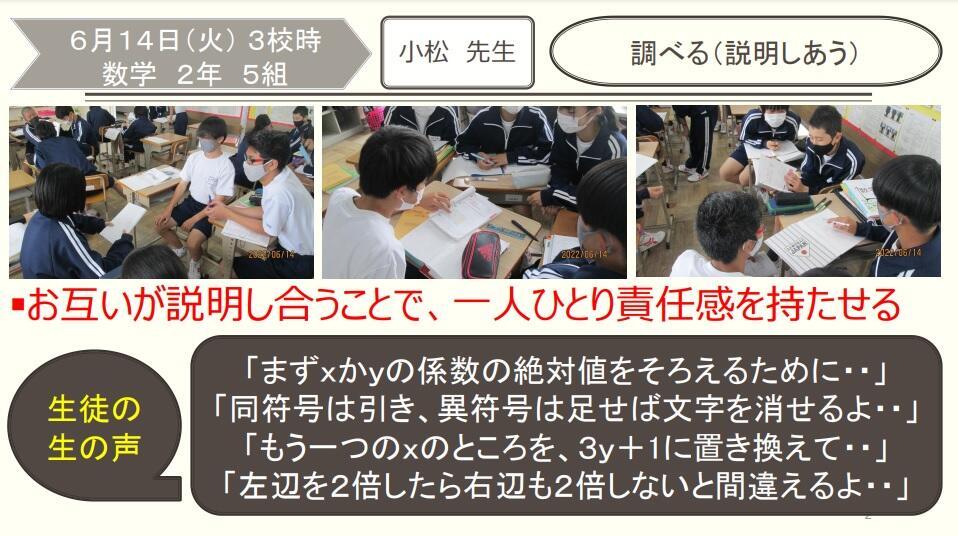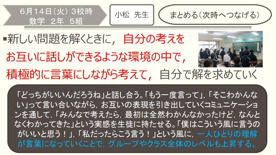 〇どの教科でも生徒どうしの学び合いの時間をできるだけ確保しています。その際は、一人ひとりが新しい答え(解)を作り出すため、「結局は先生が教えてくれたことが答えでしょ」と終わらせるのではなく、「これってほんとかな?」と根拠を確かめたり、「自分の知識と今教室で習ったことは同じかな?違うかな?」と考えてみたりすることが深い学びになります。また一つの問題が解けたら、「これがわかると次にどんな問題が解けるのだろう?」と構え、次の問題がきたら「あそこで習ったあれ使って解けるかな?」と考ることも大事になってきます.