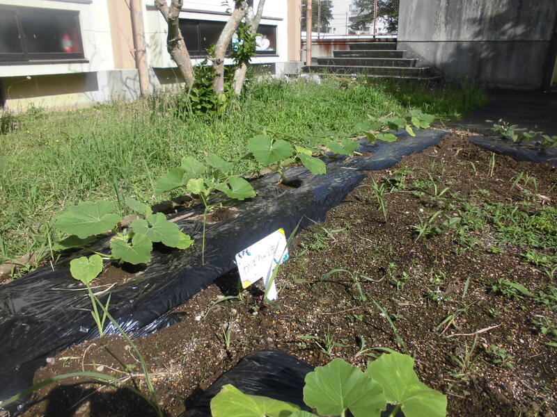 〇またプール前の花壇ではサツマイモ(紅はるか)とこちらは食べられませんがジャンボカボチャ(アトランティックジャイアント)を植えました。ジャンボカボチャの苗は、JAちば東葛富勢支店からいただきました。今秋にその大きさを富勢中学校区の小中4校(富勢小、富勢東小、富勢西小)で競い合います。さてどのくらい大きくなるでしょうか?楽しみです。